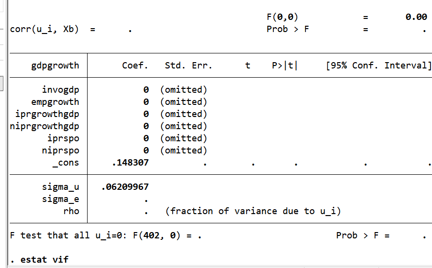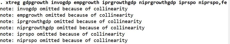 浪里个浪啦 发表于 2020-4-24 11:01 在用stata进行面板数据的豪斯曼检验时,做第一个模型的第一步就显示所有数据多重共线性(如图),然后系统忽 ...