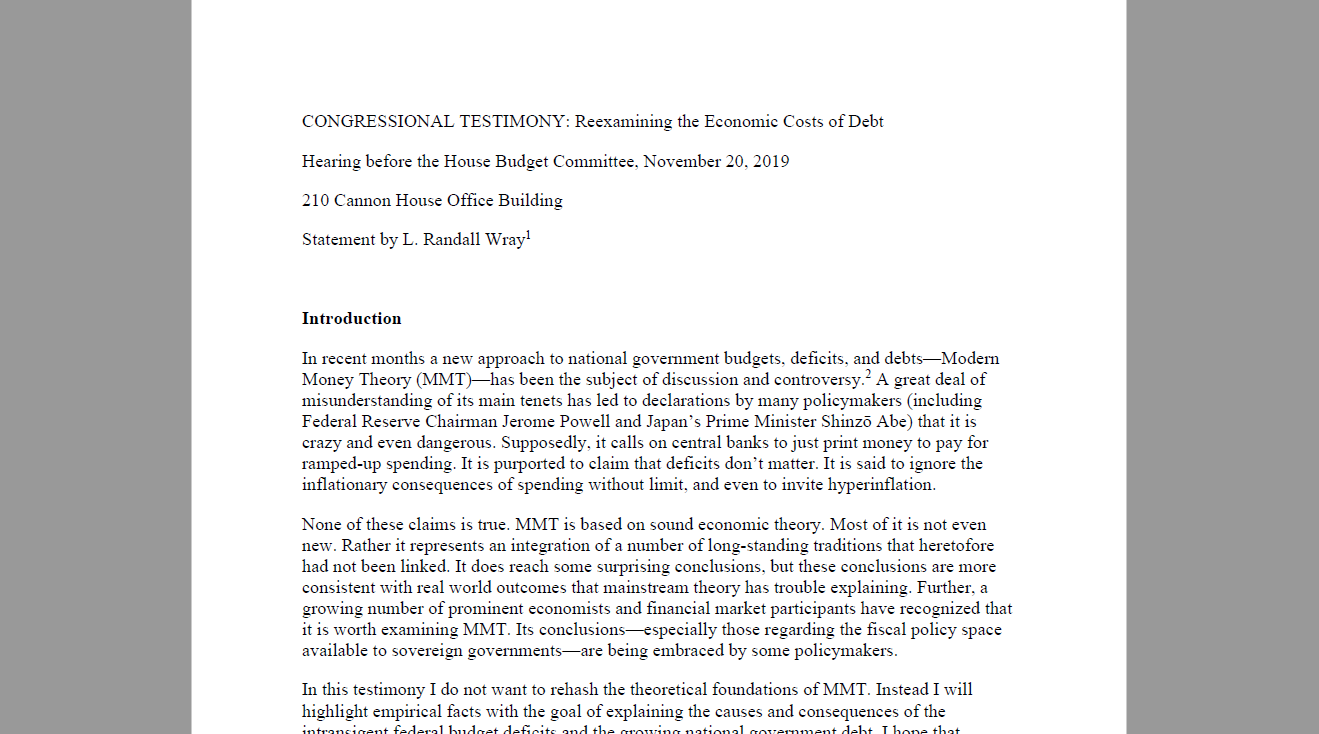 著名经济学家L.Randall Wray教授在美国国会听证会上有关现代货币理论所做的发言,非常精彩,推荐给大家