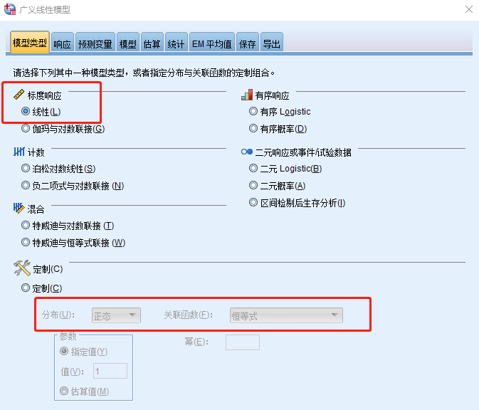 在spss中是否响应标度可以选择为线性?(我测试了一下,在使用广义线性模型,设置模型类型时,选择线性和使用定制,正态,恒等式,结果是一致的)