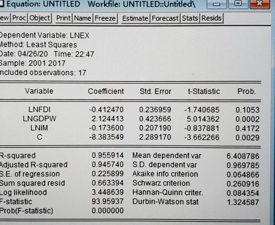 新疆出口贸易的影响因素分析。选了17年的数据,因变量:出口额ex,自变量选了:贸易伙伴国GDPw、外商直接投资FDI、进口额IM。数据进行对数处理了,单位跟检验各变量平稳性,二阶差分后均平稳,然后我就用取对数的原始数据进行ols回归了,发现t检验不同过,有的参数还出现负值,不符合经济意义了,然后这么几天也百度,说是存在多重共线性了,然后我就采用逐步回归法剔除变量,发现行不通啊,剔除只剩一个自变量,成简单线性回归了。然后我也看了看什么主成分分析法,看半天懂一点,但是想要运用到我的论文里显然我还不够斤两,一名本科生的只求有什么方法让我通过回归检验,然后我就搞个协整分析就算大功告成了。有没有热心大佬支支招啊,我得怎么搞。救救孩子吧