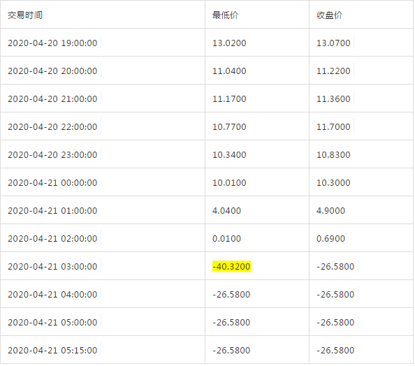2020年4月20日晚间,WTI原油期货5月合约价格开始急剧下挫。晚上19点开始油价进行第一波下跌,从13美元/桶跌至11美元/桶附近,4月21日凌晨开始第二波下跌,从11美元/桶跌至0美元/桶附近,凌晨2点开始第三波下跌,从0美元/桶暴跌至史无前例的-40.32美元/桶,最终收盘于-26.58美元/桶。这是芝加哥商品交易所集团WTI原油期货合约上市以来第一个负值结算价。