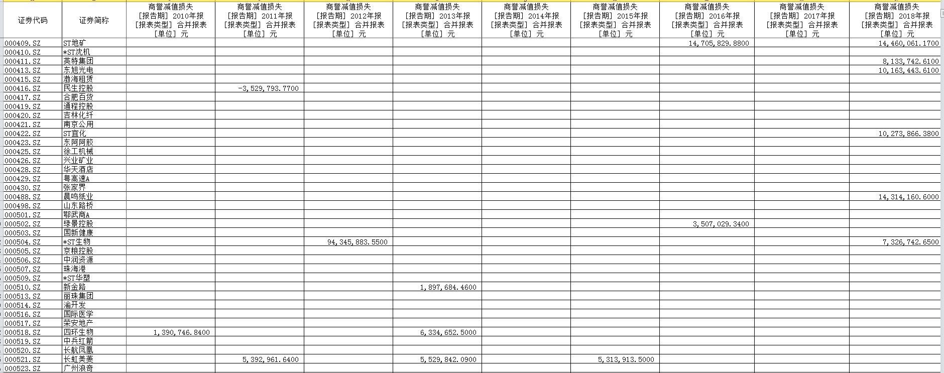资产减值损失数据(2007-2018) 包含商誉减值损失