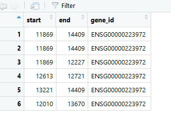 现有分析数据框df,只有start和end列的数值,但是数值并非与标准库的一一对应,只要分析数据框df的start和end列的数值范围在标准数据框范围即可,例如:分析数据框df中的start和end列的数值分别为11870、14408,也能匹配到标准数据框data里的第一行,从而得到其id名称。
