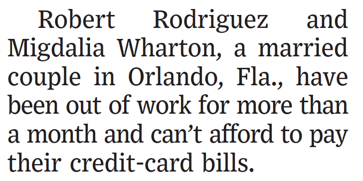 罗伯特·罗德里格斯(Robert Rodriguez)和米格达利娅·沃顿(Migdalia Wharton)是佛罗里达州奥兰多的一对夫妇。她已经失业一个多月,无力支付信用卡账单。