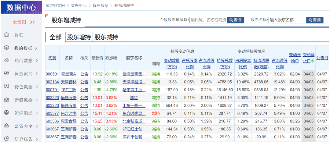 当然,财经网站的数据并不一定靠谱,需要仔细筛选排查。例如上图中东方财富网的股东增、减持数据就有不少问题。