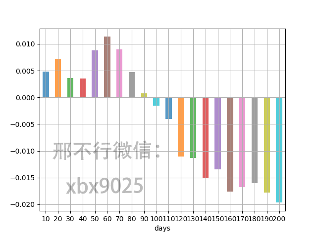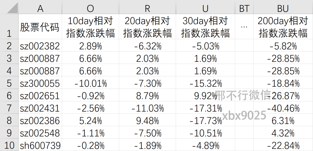 上面只列举了一部分相对涨跌幅数据,实际上我们计算到了10、20、30...200天的相对收益。该数据可以直接微信私信邢不行获取。