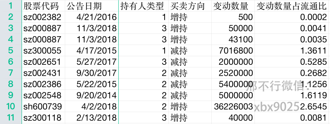 上图中截取了数据的前半部分字段,主要收集整理了股票的增减持情况,其中「持有人类型」共有三类: