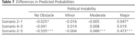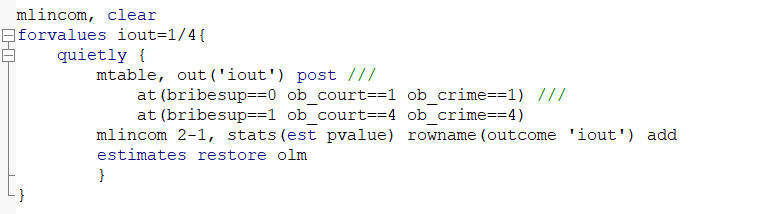mtable, post at(bribesup==0 ob_court==1 ob_crime==1) at(bribesup==1 ob_court==4 ob_crime==4)