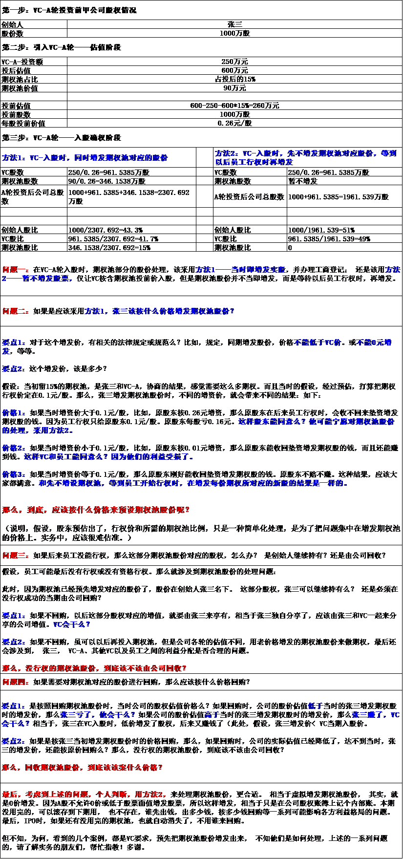 问题一:在VC-A轮入股时,期权池部分的股份处理,该采用方法1——当时即增发实股,并办理工商登记; 还是该用方法2——暂不增发股票,仅让VC按含期权池投前价入股,但是期权池股份并不当即增发,而是等待以后员工行权时,再增发。