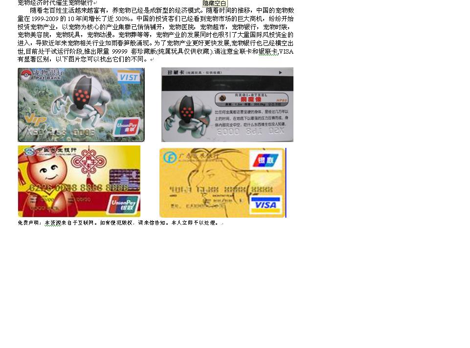 随着老百姓生活越来越富有,养宠物已经是成新型的经济模式。随着时间的推移,中国的宠物数量在1999-2009的10年间增长了近500%。中国的投资客们已经看到宠物市场的巨大商机,纷纷开始投资宠物产业,以宠物为核心的产业集群已悄悄铺开,宠物医院,宠物超市,宠物银行,宠物时装,宠物美容院,宠物玩具,宠物动漫。宠物葬等等,宠物产业的发展同时也吸引了大量国际风投资金的进入,导致近年来宠物相关行业如雨春笋般涌现。为了宠物产业更好更快发展,宠物银行也已经横空出世,目前处于试运行阶段,推出限量99999 套珍藏版(纯属玩具仅供收藏.).请注意金联卡和银联卡,VISA 有显著区别,以下图片您可以找出它们的不同。