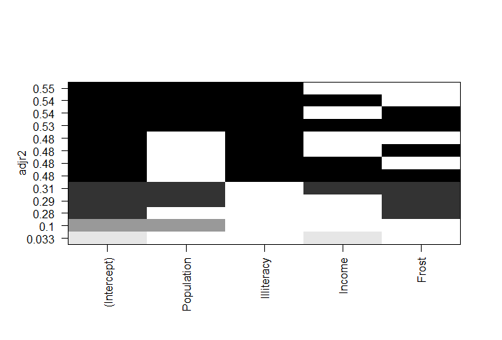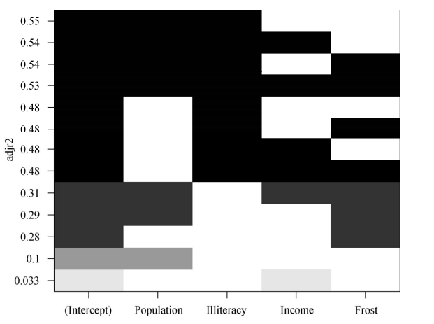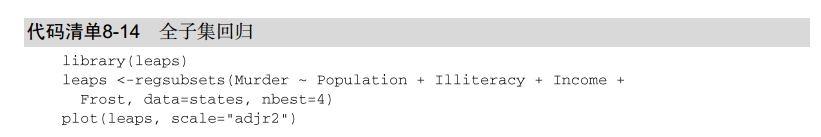 leaps <- regsubsets(Murder ~ Population + Illiteracy + Income + Frost,data=sat,nbest = 4)