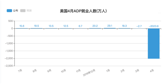 最亮眼的,莫属于美国4月ADP就业数据,一直被称为"小非农",就业人数达到了2000余万,过去一个半月的时间,美国将近有3000万人申请了失业补助,企业裁员不断的加剧之下,很多人面临失业,申请失业金的人数创下了历史性的高点。