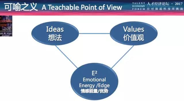 所有伟大的领导者最重要的一个特质是,他们在是领导者的同时也是非常好的老师。我称之为每个领导者都要总结出自己的“可喻之义”(teachablepoint of view)。每位领导都要把他重要的观点和决断,变成可以传授的观点理念。这个可以传授的观点理念通常包括三部分: