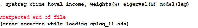 做空间面板滞后模型的时候 输入spatreg crime hoval income, weights(W) eigenval(E) model(lag)出现错误