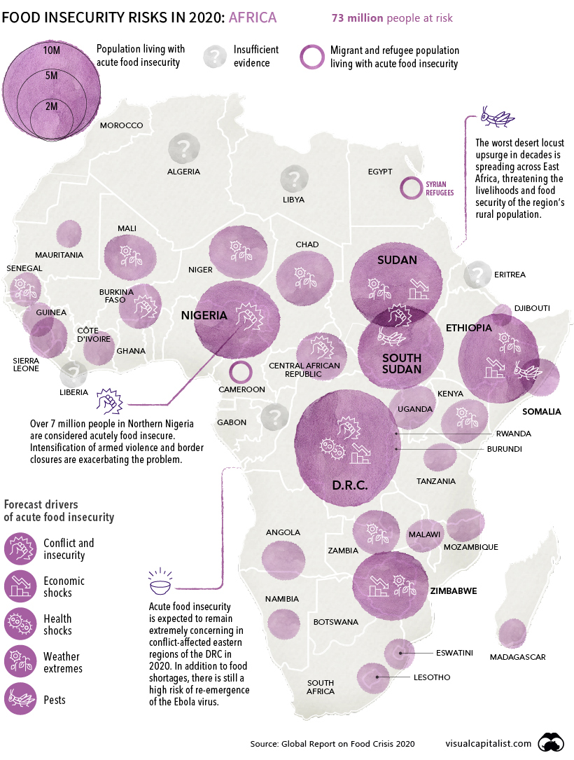 A Continent in Crisis[size=1.1]Food insecurity impacts populations around the world, but Africa faces bigger hurdles than any other continent. The below map provides a deeper dive: