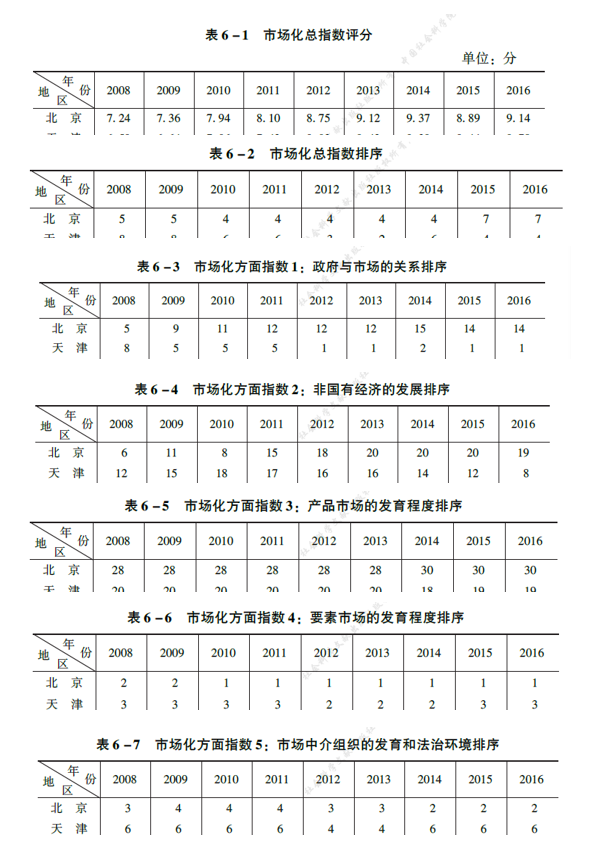 各省份市场化总指数、方面指数 评分及排序:2008 ~ 2016年,数据来自《来自中国分省份市场化指数报告(2018)》
