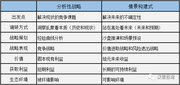 由上,我们基本可以分析出传统分析性战略和情景构建式战略之间的区别: