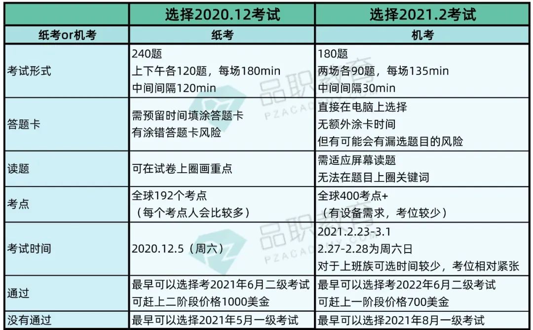 如果是还没报名而非被动延考的准CFA一级考生,那么主要考虑因素为对机考是否敏感(2020.12为最后一次纸考),对价格是否敏感(2020.12目前是第二阶段,2021.2目前是第一阶段),对持证时间是否敏感(2020.12考试可最快2022持证)。