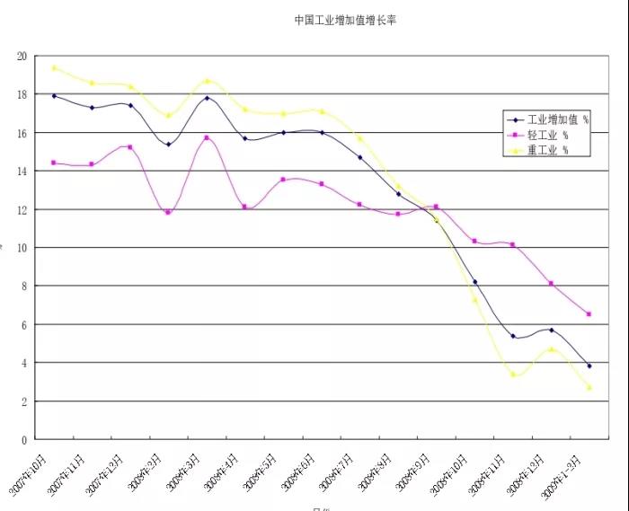 从图1我们可以看到,从2007年10月一直到2008年8月,我国轻工业的增长率(以增加值算)一直低于重工业,但从2008年9月开始,重工业的增长率开始低于轻工业。一般地,在经济繁荣的时候,上游产业,或者说重工业有着更高的增长率;而在经济衰退的时候,轻工业则有着相对较高的增长率(或相对较小的下降)。从中国的情况看,当工业增长率超过12%的时候,重工业的增长速度快于轻工业,而低于12%的时候,轻工业的增长速度则会快于重工业。危机时候尽管两者都在下降,但其下降的幅度不一样。