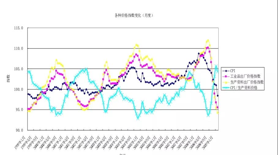 从价格的角度来看,越靠近上游的产品价格波动越大。原材料生产价格的波动幅度要大于一般的工业品,而一般的工业品又大于消费品价格的波动。在原材料工业中,采掘工业价格的波动最大。在经济危机发生的时候,生产资料价格下跌的幅度远大于生活资料,采掘工业价格下降最大。2009年1-2月,我国采掘工业价格下滑的幅度已非常厉害,达到了百分之十几。这对我们理解经济周期具有非常重要的意义,它告诉我们,经济危机更可能是过度投资导致的,而不是因为消费需求不足导致的。同时,经济周期从一个产业到另一个产业的蔓延,中间有一个重要的时间过程。