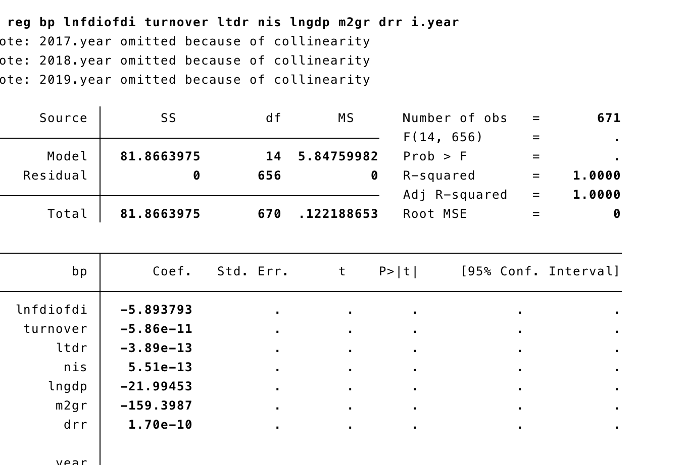 stata回归后报告t值和p值都是小点(reg y x i.year),使用稳健标准误后(reg y x i.year,r)t值和p值出现,但F值没有报告,R方为1,这是为什么。去掉年份虚拟变量后( reg y x,r) R方和F值恢复正常,  以下为回归结果,请问各位前辈这是为什么