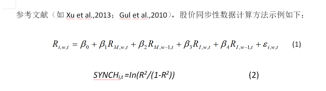 参考以上文献,本次股价同步性数据计算公式及材料说明展示如下(详细步骤请参考附件):
