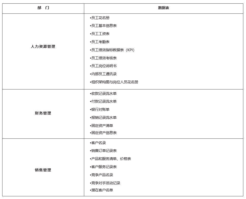 其实每一位管理者仔细思考一下自己日常的工作,就会发觉自己日常接触到的内部数据其实有很多。在这里简单罗列一下,以下这份清单几乎是所有的企业都应该有的,即使不保存在公司电脑里或者是说存储在企业管理信息系统里,各个岗位的管理者也应有一份自己的数据清单,以方便自己的工作。