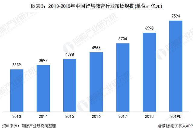 近年来,我国智慧教育发展迅速,尤其是以“三通两平台”为主要标志的教育信息化取得一系列成果。统计数据显示,2018年,我国教育信息化市场规模为4072亿元,在校教育市场规模为2518亿元,我国智慧教育行业市场规模约为6590亿元,前瞻推算,2019年,我国智慧教育市场规模约为7594亿元左右。