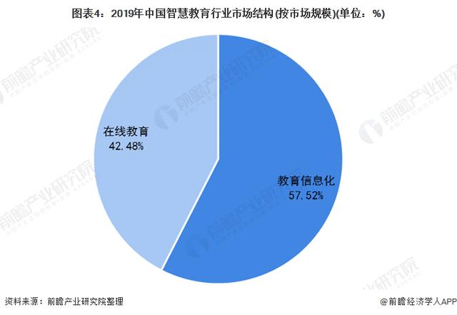 根据智慧教育的含义和特征,“智慧教育”是政府主导、学校和企业共同参与构建的现代教育信息化服务体系,智慧教育行业市场规模应该包括两大块:在线教育市场规模(主要指除学校外的社会机构提供的在线教育)和教育信息化市场规模(主要指学校实施的智慧校园等工程)。我国智慧教育行业规模持续扩大,2019年,我国智慧教育市场规模超过7000亿元。2019年,我国教育信息化投入约4368亿元,占智慧教育行业总规模的57.52%;在线教育市场规模为3225.7亿元,占智慧教育行业总规模的42.48%。
