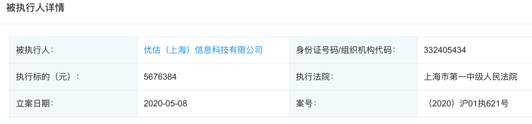 事实上,除了旗下公司成为失信被执行人,优信二手车的运营主体优估(上海)信息科技有限公司也在今年5月被上海市第一中级人民法院列为被执行人,执行标的为5676384元。