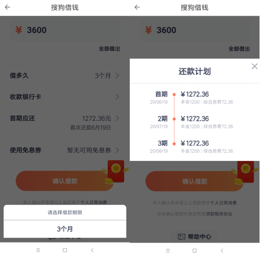 在此之前,IPO君曾尝试在搜狗借钱申请借款,但一直未通过审核。然而,今日IPO君再次提交申请,搜狗借钱通过认证,并给IPO君3600元授信。IPO君随后进入借款页面,借款金额3600元,期限只能选择3期,每期还款1272.36元,据此以IRR公式计算,搜狗借钱实际年化利率为36%。