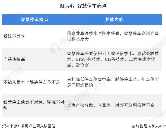 虽然我国在智慧城市概念的提出下,智慧停车在政府支持下逐步发展,智慧停车市场规模也达到了百亿以上,但与预计的万亿规模差距巨大,目前仍没有得到大规模应用,在我国经济最为发达的北上广深等地区的覆盖率也仅有7%。智慧停车的痛点较多,解决难度也较大。智慧停车系统集停车场信息管理、查询、车位预约、反向寻车、缴费、设施共享等功能为一体,但是受技术的限制,系统不兼容,导致信息共享遇到技术与资本壁垒;智慧停车需要使用到无线通信技术、移动终端技术、GPS定位技术、GIS等技术,工程集成度较高,造价高;智慧停车只能降低停车位置空率,缓解停车难,但车位不足问题难根治等。
