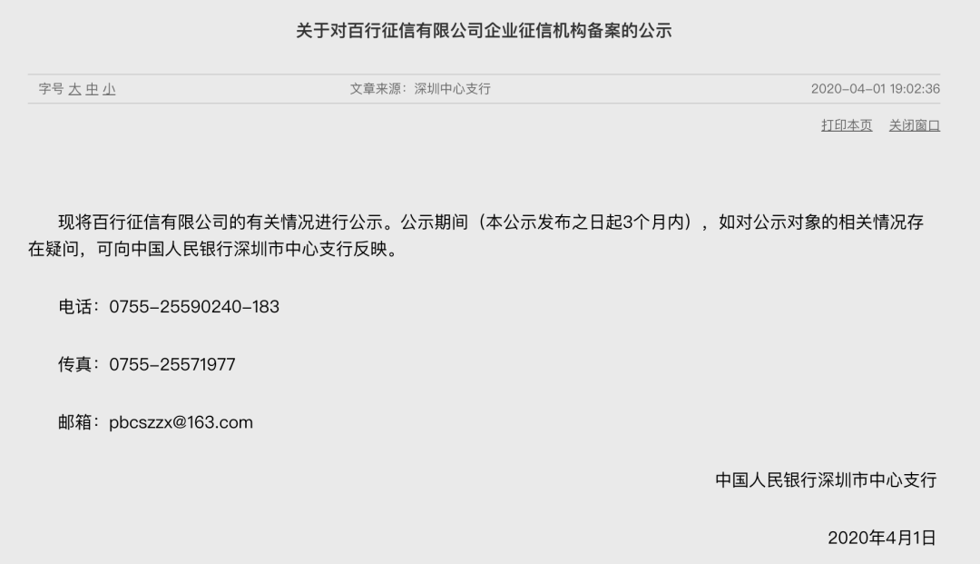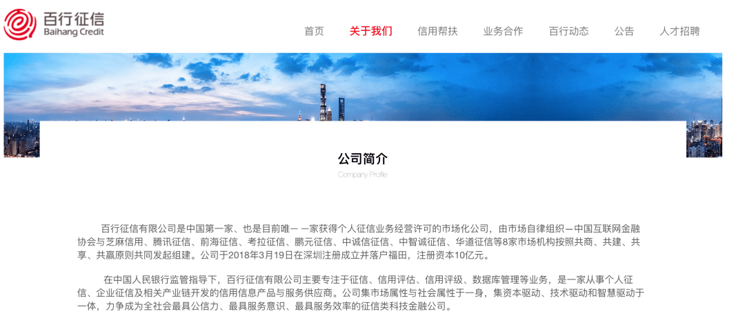 公开资料显示,百行征信由中国互联网金融协会与芝麻信用、腾讯征信、前海征信、考拉征信、鹏元征信、中诚信征信、中智诚征信、华道征信等共同发起组建,于2018年3月19日成立,注册资本10亿元,是中国第一家、也是唯一一家获得个人征信业务经营许可的市场化公司。