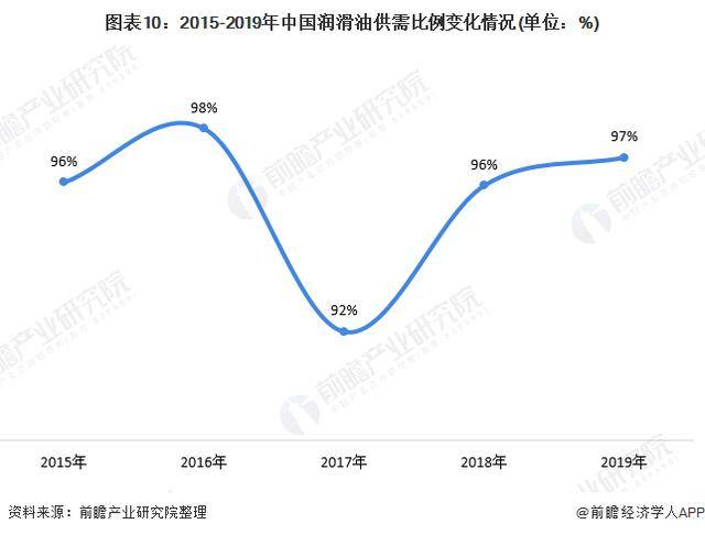 从我国润滑油供需比例分析,2015-2019年,我国润滑油供需比例均小于1,说明近几年我国的润滑油市场供给量小于市场需求量。其中,2017年以后,我国供需比例逐步提高,至2019年,供需比例达97%。