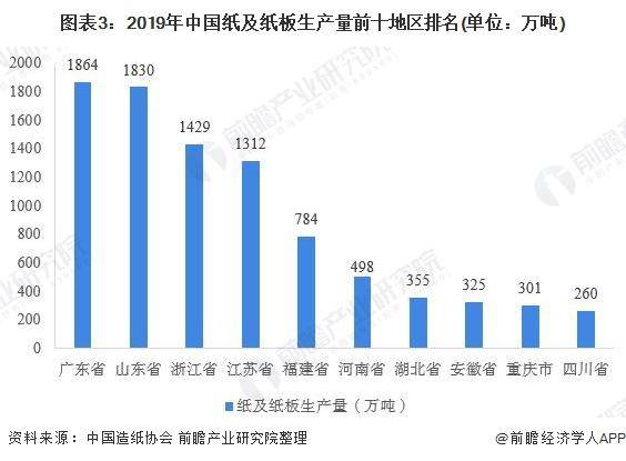 具体到各地区来看,我国纸及纸板生产主要集中在广东、山东、浙江以及江苏等沿海省份。据中国造纸协会统计数据显示,2019年,广东省纸及纸板生产量为1864万吨,占全国总产量的17.31%,排名第一;山东和浙江紧随其后,纸及纸板生产量分别为1830万吨和1429万吨,占全国总产量的比重分别为16.99%和13.27%。