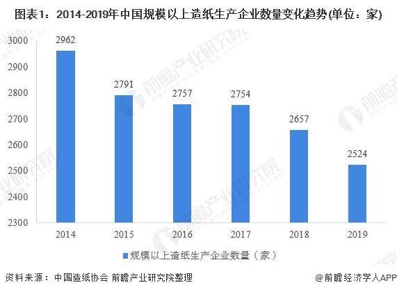 据中国造纸协会统计数据显示,2014年以来,我国规模以上造纸生产企业数量整体呈现震荡下行趋势,截至到2019年底,我国规模以上造纸生产企业数据下降至2524家,较2014年减少超过400家。
