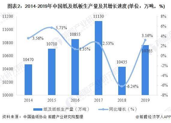 据中国造纸协会统计数据显示,2014年以来,我国纸及纸板产量整体呈现震荡上行趋势,增速保持在低位运行。2017年,我国纸及纸板生产量首次突破11000万吨,创历史新高;2018年,受行业景气度下滑影响,整体产量小幅下滑,到2019年,我国纸及纸板生产量有所回升,累计产量为10765万吨,同比增长3.16%。