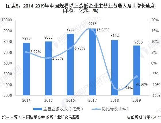 据中国造纸协会统计数据显示,2014-2017年,我国规模以上造纸企业主营业务收入稳步提升,2018年以来,随着我国造纸行业落后产能淘汰工作的持续深入以及原材料价格波动影响,我国规模以上造纸企业主营业务收入有所下滑,2019年,全国规模以上造纸企业主营业务收入为7650亿元,同比下降6.16%,下降幅度有所下降。在统计的2524家造纸生产企业中,亏损企业有560家,占22.19%。