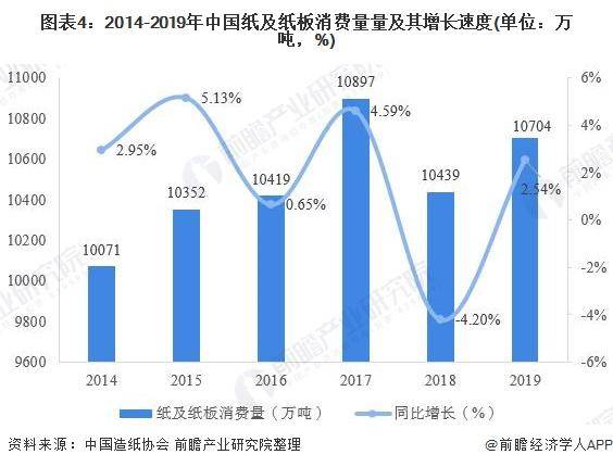 纸及纸板消费方面,据中国造纸协会统计数据显示,2014年以来,我国纸及纸板产量整体呈现震荡上行趋势,增速保持在低位运行。2017年,我国纸及纸板消费量突破11000万吨,创历史新高。2019年,我国纸及纸板消费量为10704万吨,较上年增长2.54%,人均年消费量为75千克。