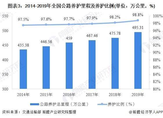我国自20世纪80年代开始高速公路的修建,已建成的大部分高速公路设计寿命为15-20年,但由于超载、使用保养不当,有些路段实际使用10-15年甚至更短的时间内就出现开裂、泛油、剥落、严重车辙等问题。在高速公路网络大规模建设的同时,高等级公路和此等级公路的保养维护,尤其是路面保养维护将是一个不可忽视的市场。近年来,公路养护里程占公路总里程比例不断上升;2014年公路养护里程所占比例已达97.5%。据交通运输部统计数据显示,2019年,我国公路养护里程495.31万公里,占公路总里程98.8%。