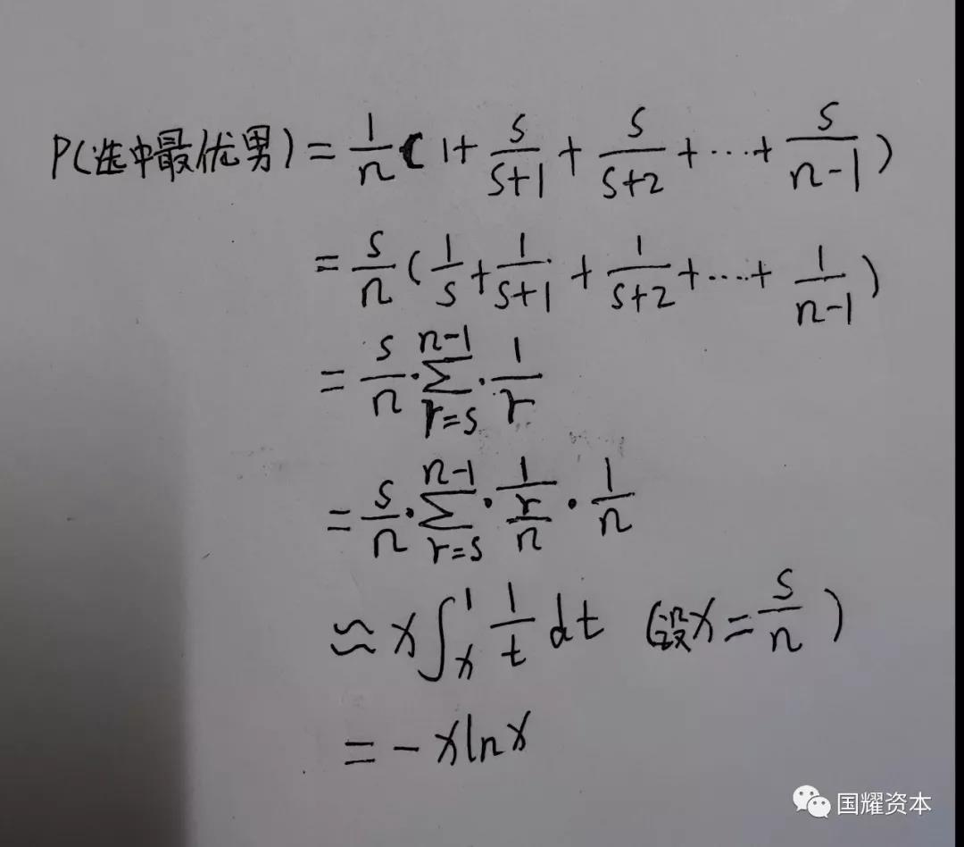 这样,以上各概率的和即为P(被你选中|当前男生为最优男)=1+s/(s+1)+s/(s+2)+s/(s+3)+···+s/(s+k-1)+···+s/(n-1)
