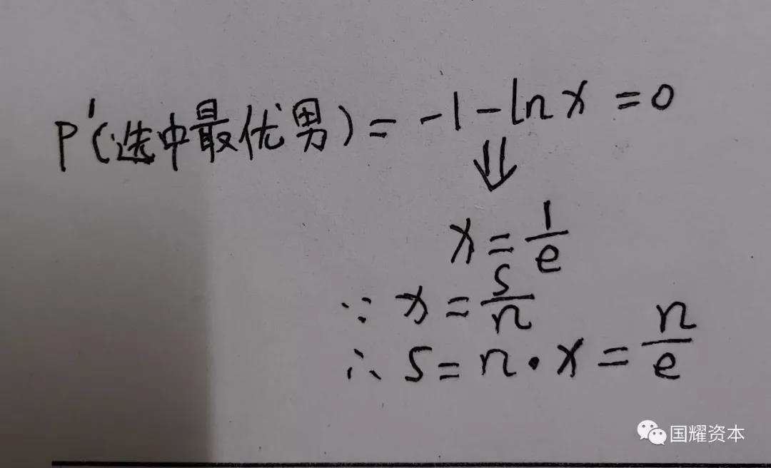 要使 P(选中最优男) 取得最大值,根据初等数学,当且仅当在其函数的导数为零处取得,即: