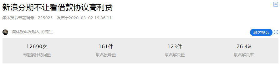 瞭望消金发现在聚投诉上,很多新浪分期用户的遭遇与壮哥一样。关于“新浪分期不让看借款协议高利贷”集体投诉专题的访问量多达12690次,其中联名投诉量有161件。