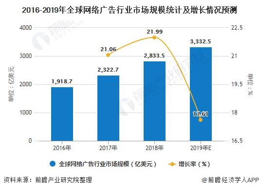据eMarketer数据,2016-2018年全球数字广告市场规模总体呈逐年增长态势。2018年全球网络广告市场规模为2833.5亿美元,同比增长21.99%。初步估算2019年市场规模约3332.5亿美元。