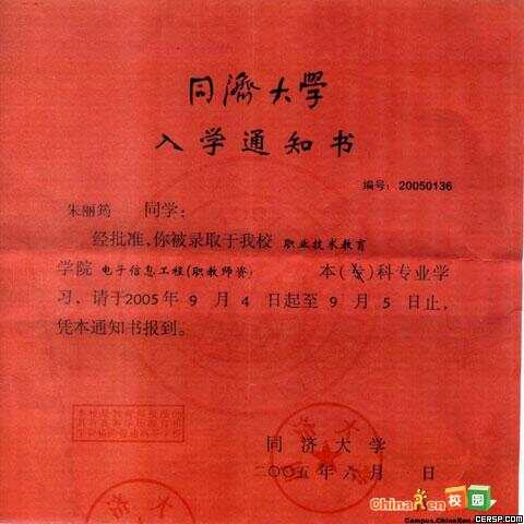 同济大学的录取通知书看上去很普通,没有名校的“富贵气”,但“百年同济”和学校的校徽,增加了录取通知书的分量。大红色的通知书,左上角写着“2007年录取通知书”,右下方盖有百年同济的校徽和同济大学招办的印章。通知书背面,是今年的全新创意,暗藏近百个浅色的“百年同济”水印。