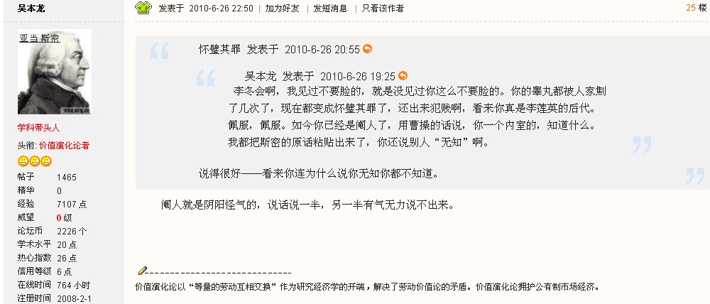 怀璧其罪 发表于 2010-6-27 18:09 鄙人说话虽说有时不留情面——这被某些人视为“讽刺”和“挖苦”,但也绝不敢如此人这般恶毒放肆过,两天了,不见任何说法。当初锁我ID时倒是毫不含糊且雷厉风行。。。。。。。。。。。。。