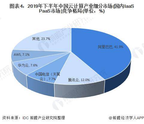 随着我国云计算市场不断发展,竞争日益激烈。国内市场竞争格局方面,根据IDC发布的《中国公有云服务市场半年度跟踪报告》,2019年下半年延续了上半年的市场集中化趋势。阿里、腾讯、中国电信、华为、AWS位居IaaS+PaaS及IaaS市场前五,在IaaS+PaaS市场总体占据76.3%的市场份额,其中阿里以其强大的客户、生态和运营能力,持续助力互联网行业业务系统上云,不断深耕零售、政府和金融三大行业云化转型,在云计算细分市场(IaaS+PaaS市场)上竞争优势明显,占比达到41.9%,持续拉大领先优势,呈现出“一超多强”的格局。