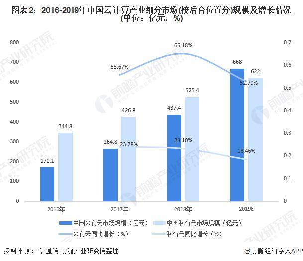 根据中国信息通信研究院数据,我国公共云服务逐步从互联网向行业市场延伸,2018年中国公有云市场规模达到437.4亿元,同比增长65.18%。互联网企业需求保持高速增长,传统企业上云进程加快,拉动了公有云市场规模快速增长,初步估计2019年公有云市场规模约为668亿元。