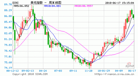 今年上半年,美元继续延续2008年7月以来的走强趋势。作为衡量美元币值强弱的关键指标,自2009年底以来,美元指数从75点升值16%到了目前的87点。同时各主要非美货币兑美元呈现普跌之势,其中以欧元最具代表,欧元兑美元不仅从1.51美元高点位置跌去逾21%,并且已经跌破金融危机时期的低点,同时在下破1.20美元大关后不见有放缓之意。参见美元指数走势图: