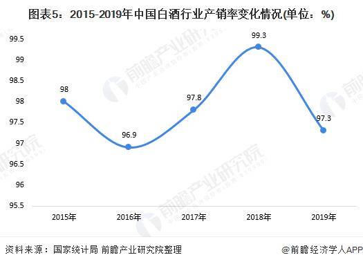 整体来看,我国白酒行业的产销率呈现先升后降的趋势。2018年,在行业产量大幅下降的情况下,去除了大量的白酒库存,实现99.30%的产销率;2019年,行业产销率下降至97.3%,说明产品需求小于供给,前期去库存的措施效果明显。